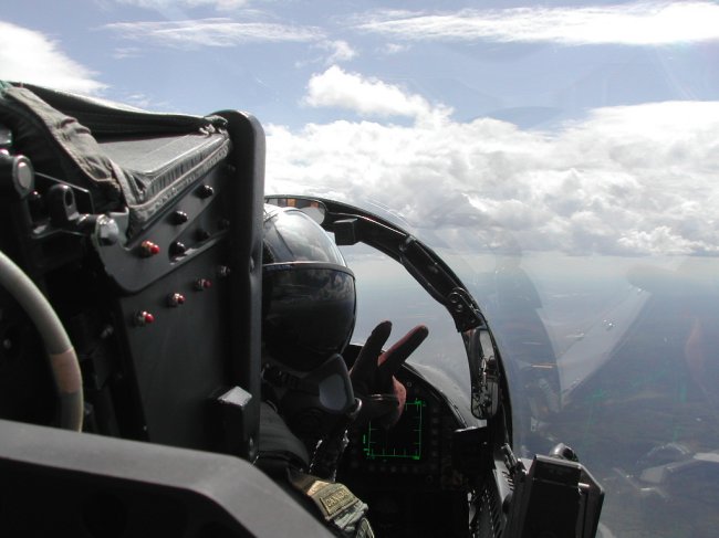 After about 40 minutes of BFM, ‘bingo’ was called. We set up the standard ‘battle damage check’ and then started back for the Base. Our 2 ship performed a nice formation into the break over the Base. On final my pilot realized we had a bit of extra fuel we could burn. Performing a ‘touch-an-go’, we took-off again. Once wheels and flaps were up, the pilot skimmed the earth to the end of the runway limits. He then pulled into a nice 4.5 g vertical and cranked us off to the right. We went around and did another touch-an-go. This time we headed off a bit further. We flew about 4 or 5 miles away from the Base. The pilot then gave me control of the jet. He instructed me to put in full afterburner and execute a 4 g right hand turn. After lighting the burners, I pulled to the right and pulled back on the stick. I was at about 2 g’s when the pilot came back on the radio and said “Come on ya pussy, pull 4 g’s!!” So at that, I pulled the stick much harder. After executing a 5.5 g turn and rolling back out into straight flight the pilot took control back. The next radio call was, “Good job, you pulled 5.5 g’s instead of 4 g’s….I guess calling you a pussy was enough to egg you on!!”
